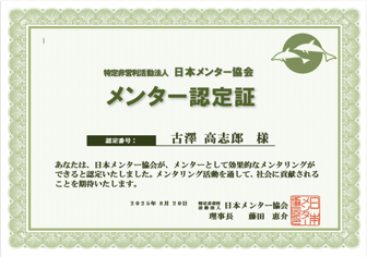 メンタリングの実践によるレポートと、“メンタリング・チャレンジ”等により、“日本メンター協会認定メンター”の資格を授与いたします。MOPの方はもちろん、他にプロとしてコンサルタントを生業とされている方、組織内、地域において、ボランティア的にメンターとして活動されたい方、メンター・メンタリングにご興味のある方なら、どなたでもチャレンジ可能です。皆様のご参加をお待ちしております。