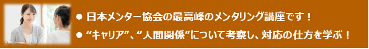 第1ステップの講座です。メンタリングのコアテーマである『キャリア』『人間関係』を考察し、プロフェッショナルなメンタリングを実施するスキルやスタンスを学びます。