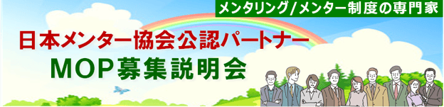 日本メンター協会では、こうした社会的要請にこたえるために、メンタリングおよびメンター制度の運用を的確に普及させるために、日本メンター協会公認パートナー《MOP》を募集します。